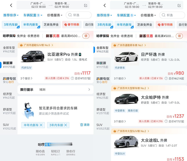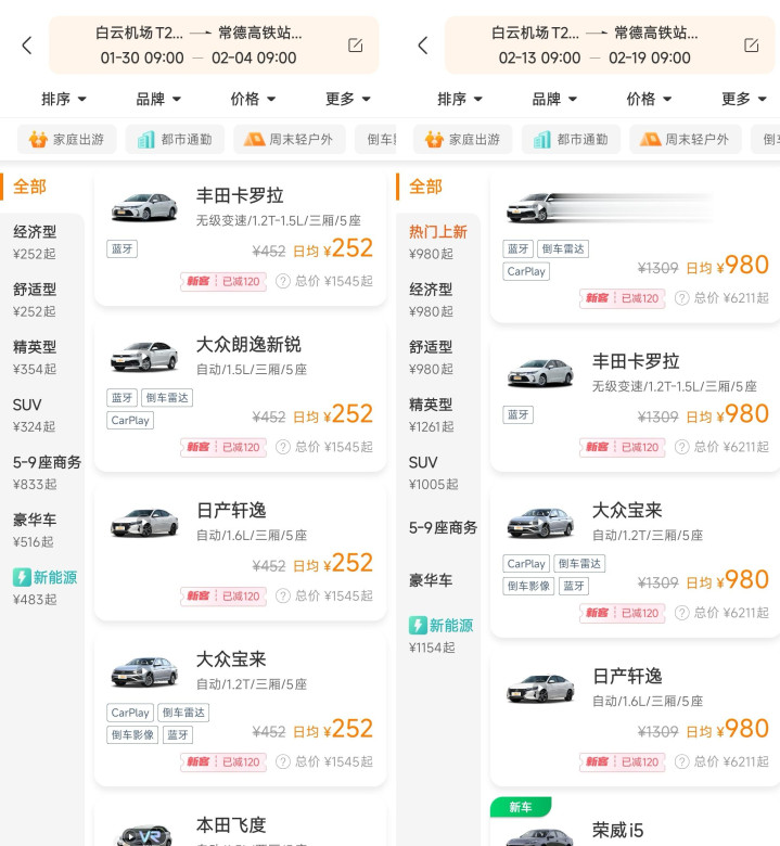 价格方面,经济型、舒适型及新能源车日均起步价均在900-1000元范围内,实测下来较非高峰期溢价明显,这也是市场供需关系的必然结果。而且,如果你有装年货的需求,选择租SUV的话,日均起步价直接破千,钱包瞬间就不淡定了。